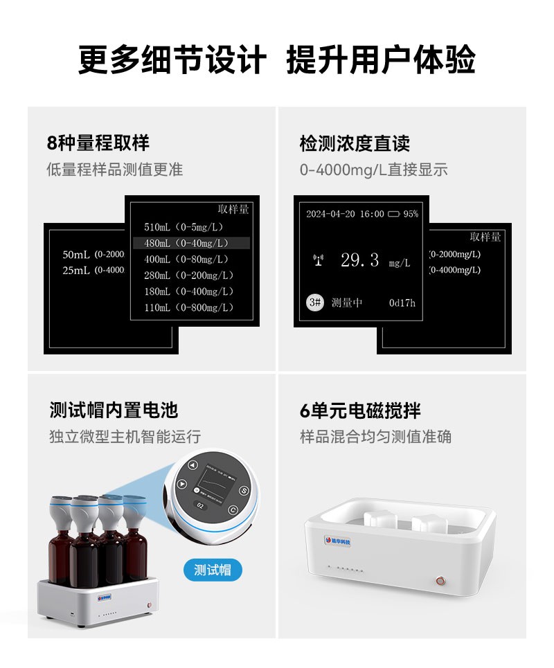3、量程0-4000mg/L,支持8种量程取样选择,检测浓度直读,无需换算直接显示BOD值,硬件升级低量程测值更准;