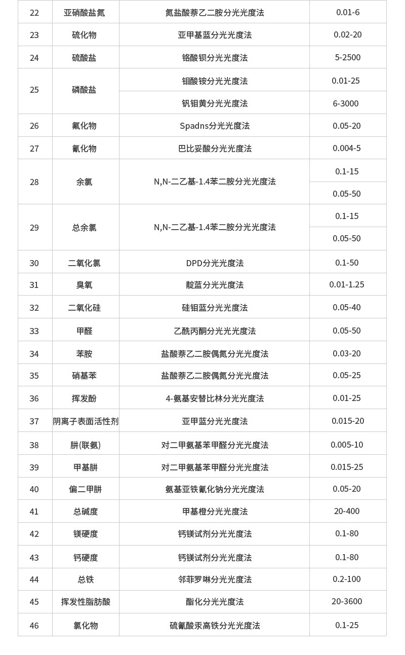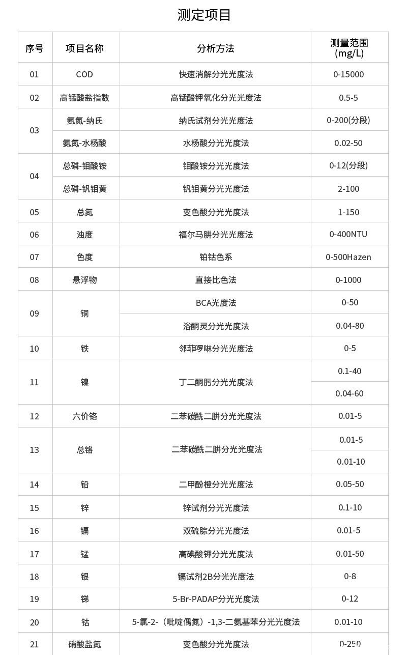 1.测量范围:COD:(0-15000)mg/L氨氮:(0-160)mg/L总磷:(0-100)mg/L总氮:(0-150)mg/L2.示值误差:常规指标≤±5%;其他指标:≤±10%3.分辨率:0.001Abs4.曲线数量:12205.重复性:≤±3%6.比色方式:16mm/25mm比色管10mm/30mm比色皿7.操作系统:基于安卓的LHOS8.显示屏:7吋;1024×600触屏9.存储数据:5000万组10.打印机:热敏行式打印机11.额定电压:AC220V12.主机重量:5.4kg13.主机尺寸:(420×300×181)mm14.环境温度:(5-40)℃15.环境湿度:≤85%(无冷凝)16.功耗:20W三、测定项目COD:分析方法:快速消解分光光度法依据标准:《HJ399-2007》量程范围:COD高量程:预制试剂:(20~15000)mg/L(分段);普通试剂:(20~10000)mg/L(分段)COD低量程:预制试剂:(2~150)mg/L;普通试剂:(2~100)mg/L检测限:COD高量程3mg/L;COD低量程0.5mg/L氨氮1:分析方法:纳氏试剂分光光度法依据标准:《HJ535-2009》量程范围:(0~200)mg/L(分段)检测限:0.01mg/L氨氮2:分析方法:水杨酸分光光度法依据标准:《HJ536-2009》量程范围:高量程:(0.02~50)mg/L;低量程:(0~2.5)mg/L检测限:0.001mg/L总磷:分析方法:钼酸铵分光光度法依据标准:《GB11893-89》量程范围:(0~12)mg/L(分段)检测限:0.002mg/L总磷高量程:分析方法:钒钼黄分光光度法依据标准:《GB/T21931.3-2008》量程范围:(2~100)mg/L检测限:0.5mg/L总氮:分析方法:变色酸分光光度法量程范围:(1~150)mg/L(分段)检测限:0.5mg/L浊度:分析方法:福尔马肼分光光度法量程范围:(0~400)NTU检测限:0.5NTU色度:分析方法:铂钴色系量程范围:(0~500)Hazen检测限:2Hazen悬浮物:分析方法:直接比色法量程范围:(0~1000)mg/L检测限:1mg/L硝酸盐氮:分析方法:变色酸分光光度法量程范围:(0~250)mg/L检测限:0.1mg/L亚硝酸盐氮:分析方法:盐酸萘乙二胺分光光度法量程范围:(0.01~0.6)mg/L检测限:0.003mg/L余氯和总氯:分析方法:N,N-二乙基-1.4苯二胺分光光度法量程范围:(0.05~50)mg/L检测限:0.015mg/L二氧化氯:分析方法:DPD分光光度法量程范围:(0.1~50)mg/L检测限:0.03mg/L二氧化硅:分析方法:硅钼蓝分光光度法量程范围:(0.05~40)mg/L检测限:0.015mg/L磷酸盐钼酸铵光度法::分析方法:钼酸铵分光光度法量程范围:(0.01~25)mg/L检测限:0.005mg/L磷酸盐钒钼黄光度法:分析方法:钒钼黄分光光度法量程范围:(6~3000)mg/L检测限:2mg/L硫酸盐:分析方法:铬酸钡分光光度法量程范围:(5~2500)mg/L检测限:3mg/L氟化物:分析方法:Spadns分光光度法量程范围:(0.05~20)mg/L检测限:0.015mg/L硫化物:分析方法:亚甲蓝分光光度法量程范围:(0.02~20)mg/L检测限:0.002mg/L氰化物:分析方法:异烟酸-巴比妥酸分光光度法量程范围:(0.004~5)mg/L检测限:0.004mg/L臭氧:分析方法:靛蓝光度法量程范围:(0.01-1.25)mg/L检测限:0.003mg/L铁:分析方法:邻菲啰啉分光光度法量程范围:(0~5)mg/L检测限:0.004mg/L六价铬:分析方法:二苯碳酰二肼分光光度法量程范围:(0.01~5)mg/L检测限:0.001mg/L总铬苯偕肼光度法:分析方法:二苯碳酰二肼分光光度法量程范围:(0.01~10)mg/L/(0.01~5)mg/L检测限:0.003mg/L锌:分析方法:锌试剂分光光度法量程范围:(0.1~10)mg/L检测限:0.003mg/L铜BCA法:分析方法:BCA分光光度法量程范围:(0~50)mg/L检测限:0.01mg/L铜浴酮灵法:分析方法:浴酮灵分光光度法量程范围:(0.04~80)mg/L检测限:0.01mg/L镍丁二酮光度法:分析方法:丁二酮肟分光光度法量程范围:(0.1~40)mg/L检测限:0.009mg/L镍丁二肟光度法:分析方法:丁二肟分光光度法量程范围:(0.04~60)mg/L检测限:0.01mg/L铅:分析方法:二甲酚橙分光光度法量程范围:(0.05~50)mg/L检测限:0.01mg/L镉:分析方法:双硫腙分光光度法量程范围:(0.01~5)mg/L检测限:0.002mg/L锰:分析方法:高碘酸钾氧化分光光度法量程范围:(0.01~50)mg/L检测限:0.038mg/L银:分析方法:镉试剂2B分光光度法量程范围:(0~8)mg/L检测限:0.003mg/L锑:分析方法:5-Br-PADAP光度法量程范围:(0~12)mg/L检测限:0.05mg/L钴:分析方法:5-氯-2-(吡啶偶氮)-1,3-二氨基苯光度法量程范围:(0.01-10)mg/L检测限:0.003mg/L苯胺:分析方法:盐酸萘乙二胺分光光度法量程范围:(0.03~20)mg/L检测限:0.002mg/L硝基苯:分析方法:盐酸萘乙二胺分光光度法量程范围:(0.05~25)mg/L检测限:0.007mg/L挥发酚:分析方法:4-氨基安替比林分光光度法量程范围:(0.01~25)mg/L检测限:0.005mg/L甲醛:分析方法:乙酰丙酮分光光度法量程范围:(0.05~50)mg/L检测限:0.003mg/L阴离子表面活性剂:分析方法:亚甲蓝分光光度法量程范围:(0.015~20)mg/L检测限:0.01mg/L高锰酸盐指数:分析方法:高锰酸钾氧化分光光度法量程范围:(0.5~5)mg/L检测限:0.5mg/L肼(联氨):分析方法:对二甲氨基苯甲醛分光光度法量程范围:(0.005~10)mg/L检测限:0.002mg/L甲基肼:分析方法:对二甲氨基苯甲醛分光光度法量程范围:(0.015~25)mg/L检测限:0.005mg/L偏二甲肼:分析方法:氨基亚铁氰化钠分光光度法量程范围:(0.05~20)mg/L检测限:0.015mg/L总碱度:分析方法:甲基橙分光光度法量程范围:(20~400)mg/L检测限:6mg/L镁硬度/钙硬度:分析方法:钙镁试剂分光光度法量程范围:(0.1~80)mg/L检测限:0.03mg/L总铁:分析方法:邻菲罗啉分光光度法量程范围:(0.2~100)mg/L检测限:0.05mg/L挥发性脂肪酸:分析方法:酯化分光光度法量程范围:(20~3600)mg/L检测限:5mg/L氯化物:分析方法:硫氰酸汞高铁分光光度法量程范围:(0.1~25)mg/L检测限:0.03mg/L